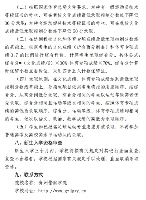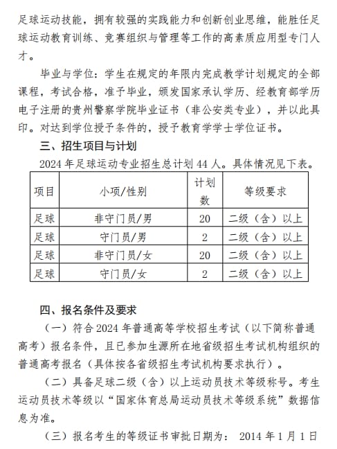贵州警察学院2024年足球运动专业 (非公安类专业)招生简章